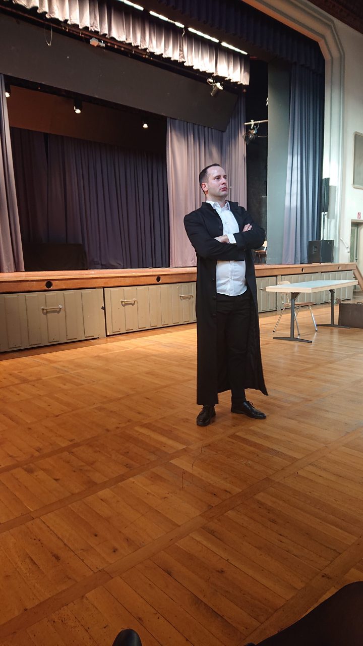 In einer dynamischen und temporeichen Inszenierung gelang Schlösser Erstaunliches: Er stellte nicht nur alle Figuren des Faust-Dramas selbst dar – in übrigens beeindruckender mimisch-gestischer sowie stimmlicher Gestaltung –, sondern vermittelte zwischen einzelnen Szenen den Faust-Stoff dem Publikum auf unterhaltsame und anschauliche Weise. Da wurde erklärt, wer eigentlich diese „Helena“ ist, die Faust zum Abschluss der „Gelehrtentragödie“ am Horizont zu sehen meint, und wie ein „Drudenfuß“ aussieht, der Macht über Mephisto hat. Das für die SchülerInnen eindrücklichste Moment der Inszenierung stellte aber das „Mitspielen“ in einigen Szenen durch zufällig ausgewählte SchülerInnen dar. So fand sich mancher, der sich zuvor noch sicher im Publikum sitzen wähnte, plötzlich auf der Bühne wieder und stellte spontan-improvisierend Gretchens Bruder Valentin oder gar Gretchen selbst dar – Isabelle befragte brav das Blumenorakel, das ihr Auskunft über Fausts Liebe geben sollte. Und der Schüler Wagner – wie passend, saßen doch (fast) nur SchülerInnen im Publikum – durfte gleich mal mit Heinrich Faust eine Runde durch die Festhalle drehen, den Osterspaziergang nachspielend.